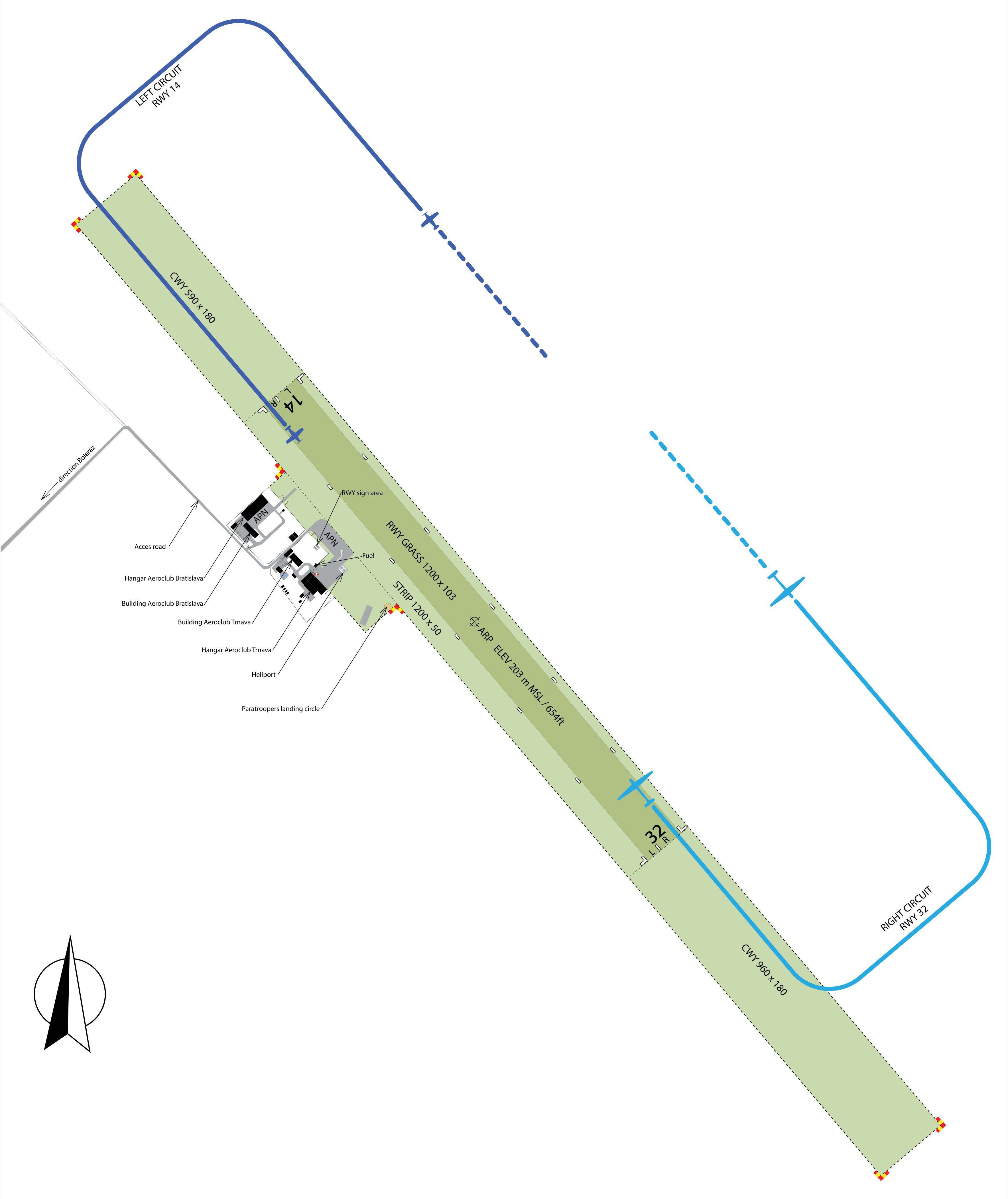 Letiště má délku 2600 metrů, udržovaná dráha má délku 1200 metrů. Šířka dráhy je 110 metrů.